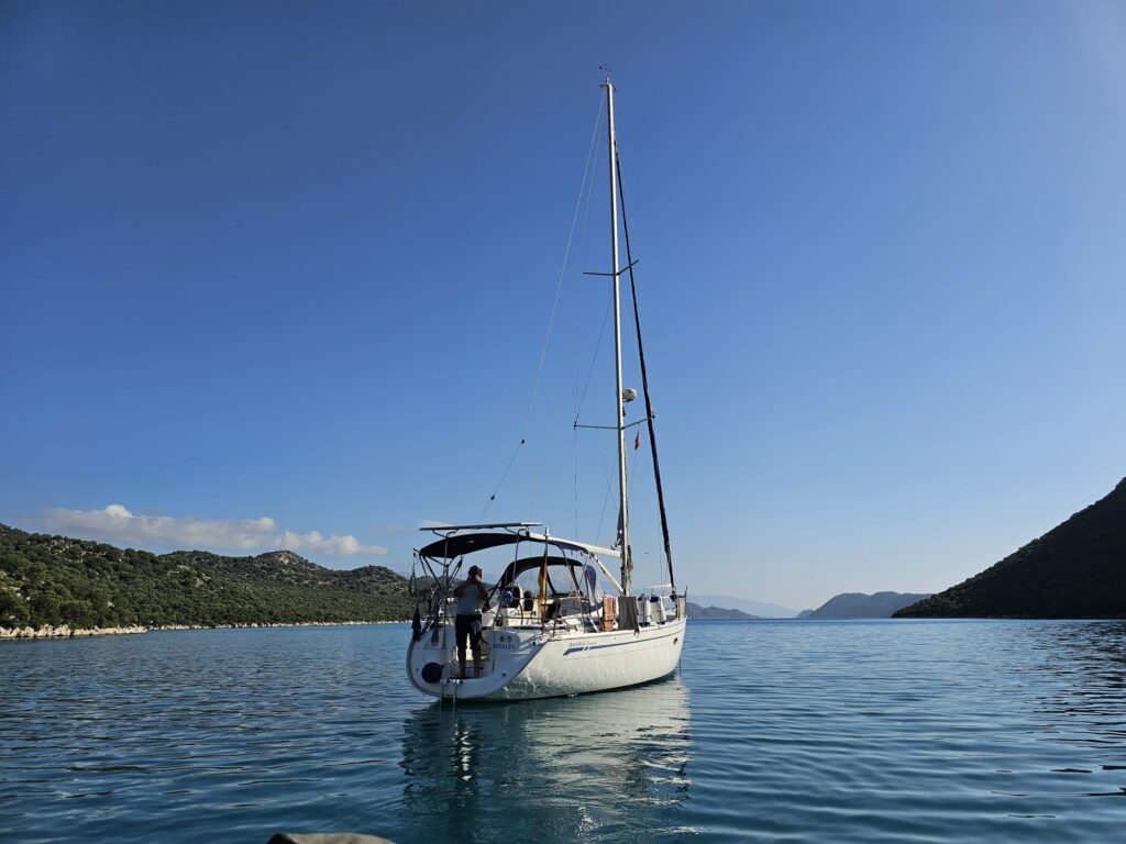 Um 08:00 Uhr kommt Leben ins Boot. Zunächst ein erfrischendes Bad im Meer. Dann ein ausgiebiges Frühstück an Deck. Unsere Tagesetappen sind so gelegt, dass wir morgens keine Eile haben müssen. Wir haben uns kurz vor Antritt der Reise geeinigt, dass wir auf große Schläge verzichten und die Woche im Gebiet Kekova Körfezi zubringen werden. Es soll ab Mittag gute Segelwinde geben. Um 10:30 Uhr Anker auf mit Kurs zur Durchfahrt zwischen den Inseln Akar und Icada. Robert ist heute am Ruder. Um 13:30 Uhr erreichen wir die Durchfahrt. Anschließend geht es unter Fock mit achterlichem Wind weiter bis zur Einfahrt in den Kekova Körfezi. Der Düseneffekt macht sich deutlich bemerkbar. Bei der Ansteuerung von Polemos Bükü bläst es mit bis zu 24kt. Das scheint eine lustige Nacht zu werden. Wir ankern auf 8 Meter Tiefe daher aber mit 60 Meter Kette. Die elektronische Ankerwache am iPad zeigt, dass Merlin zwar wie gewohnt tänzelt, wir uns aber keinen Meter versetzen. Der Anker hält!